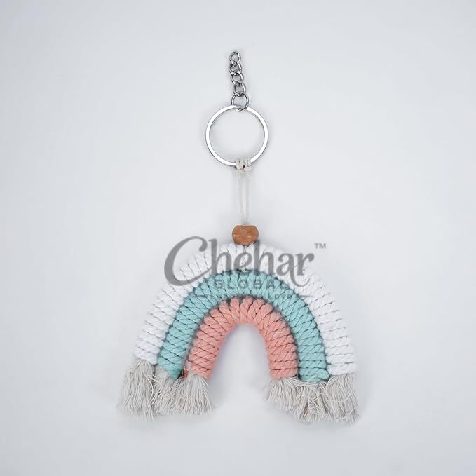 Handmade macrame rainbow keychain featuring vibrant, braided cords and a sturdy metal ring. Each colorful knotwork is crafted with care, creating a decorative, eye-catching accessory for bags, keys, or backpacks. Lightweight, durable, and cruelty-free material. Perfect gift for friends and family, or a cheerful treat for yourself. Add a splash of positivity to daily routines. Brighten any key collection today.